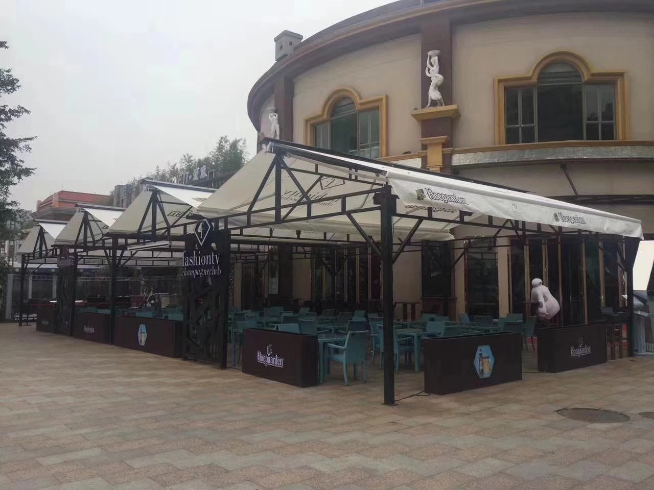 此款遮陽棚性價(jià)比較高,使用壽命長,能制作更寬更長的篷架,適合大型場所遮陽擋雨的需要。